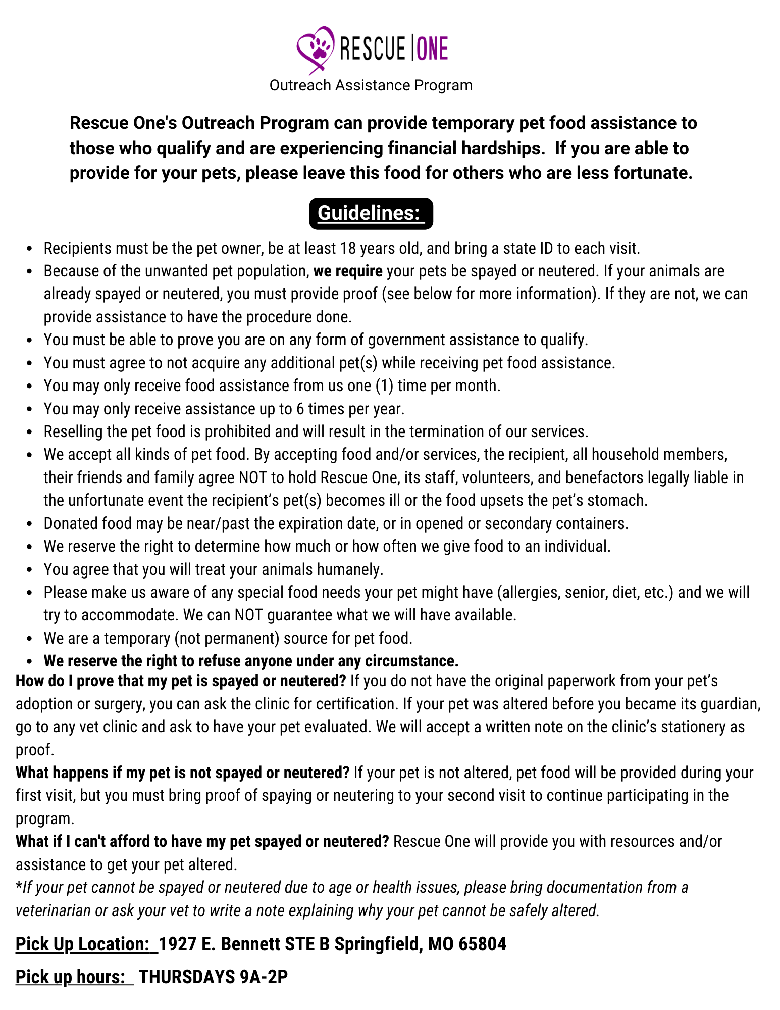 Rescue One can offer temporary pet food assistance as food is available. Food can be picked up on Tuesdays from 8:30am-11:30am and Thursdays 4pm-7pm at 1927 E. Bennett STE B Springfield, MO 65804. An in person application is required. Please see below guidelines to participate.